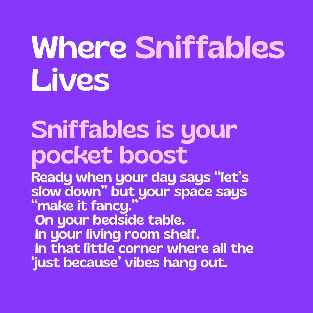Sniffables – SoftWhoosh 1-PACK Imagine stepping into a quiet, sunlit room, the air smooth and soft, carrying a subtle, grounding breeze. That’s the feeling we captured. We weren’t chasing just another scent — we wanted to shape the mood of your space. Something warm, calm, and effortlessly comforting. The result? SoftWhoosh. SoftWhoosh sets the tone. A blend of vetiver, lavender, bluetansy, sandalwood amyris, and chamomile that drifts gently through the room. It’s like pressing pause, letting your mind settle, and sinking into a moment of drift.